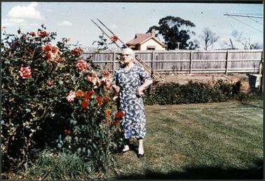4. This image shows an elderly woman standing by a rose bush in a back garden. She is wearing a blue and white patterned dress, and glasses. Her hair is white.