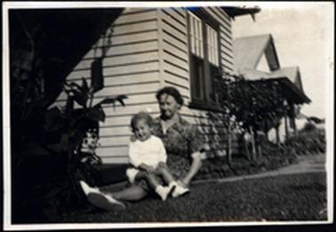 DESCRIPTION1. This image shows a woman sitting on the grass in front of a weather board house. She has a little child, maybe a boy, dressed in white on her lap. There are standard rose trees in the garden, and it appears to be a warm day.