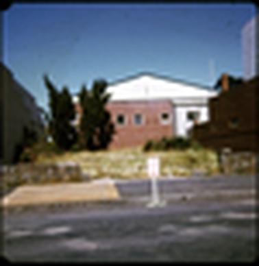 DESCRIPTION1. This image shows the rear of a red brick building. It has a pitched roof. There are small windows, and it looks like an industrial building. To the right of the photo is a small fibro add on, with a metal roof, and a small window. In the centre foreground is a road sign “No standing any time”. To the right of the image is a small wall built of the local rock. There is a stack of timber on the left on the footpath.