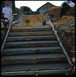 DESCRIPTION1. This image shows two work men creating a set of steps. They are making a wooden frame. In the centre of the picture one of the men in a tartan shirt is carrying a plank. The other man if a blue shirt and cream pants is in the foreground. To the left is a stack of cream bricks.