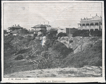 2. This is another view of the Esplanade. In the centre is Kirkpatrick’s and to the right is The Royal Hotel. To the left of the photo is another impressive building, and in between is a one storey dwelling with a verandah along the front, and a pitched roof. In the foreground is a white picket fence.
