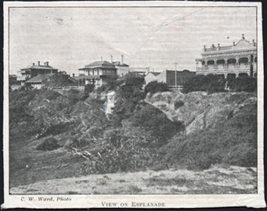 1. This is a view from the beach looking up to the Esplanade. Three striking buildings can be seen, with several small dwellings between. To the right of the picture is the Royal Hotel with it’s beautfull verandahs on both levels, and in the centre is Kirkpatrick’s Hotel with it’s original verandahs, similar to the Royal. To the left of the image is another impressive building.
