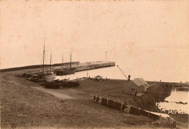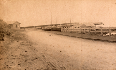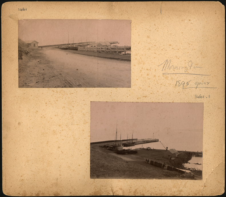 1. This shows a view of the Mornington Pier from the unmade road. There is a wooden fence running down to the Pier. Several masts can be seen in the centre of the image. On the left is a shed.