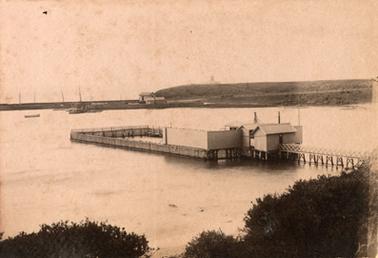 Sea bathing in specially erected structures built over the water enjoyed a heyday of popularity in the latter part of the 19th century, and the early 1900’s. The Baths which were built at the base of a cliff between Shire Hall Beach and the Pier at Mornington offered facilities of dressing rooms and diving boards. They continued to be used by large numbers of people up to and beyond the time of World War 2. In the 1890’s the proprietor was William Irvine, who advertised the bathing hours at his Royal Baths with different times for gentlemen and ladies, so they didn’t bath together.