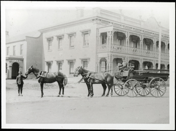 DESCRIPTIONThis photo shows the Royal Hotel with horses and cart in front. The Royal Hotel in the back ground has beautiful iron work to both verandahs, up and down. There are 3 black horses pulling the cart which is stationery. There is a man stood holding the reins of the leading horse, and another man sitting in the driving seat. The cart appears to be a passenger carrying vehicle.