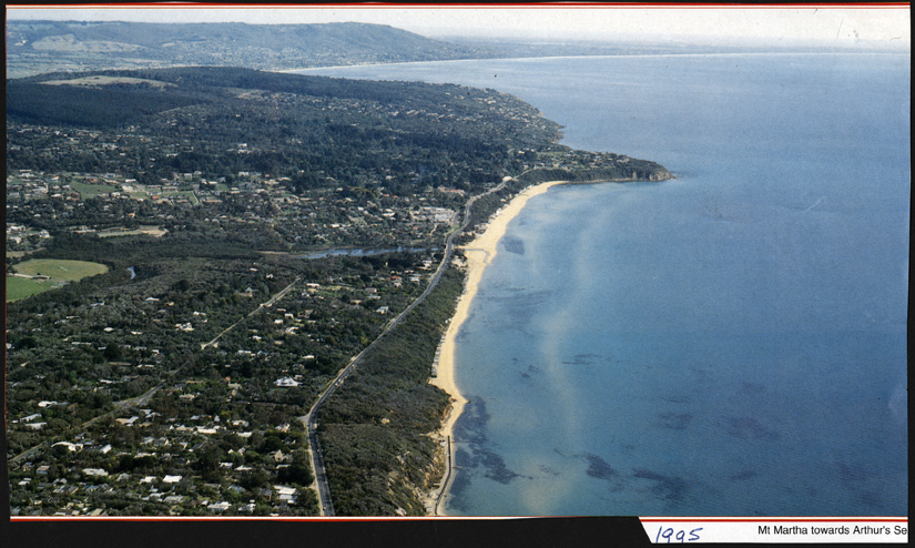 DESCRIPTIONThis is a view from above showing a large area of Mt Martha. Port Philip Bay is on the right of the photo. The beach runs vertically from the bottom to the top of the picture. Arthur’s Seat can be seen in the back ground.