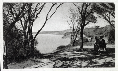 DESCRIPTIONThis image shows a view across the Bay from the headland. On the right are two men sitting in suits and hats. They are in shady spot under the trees.