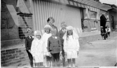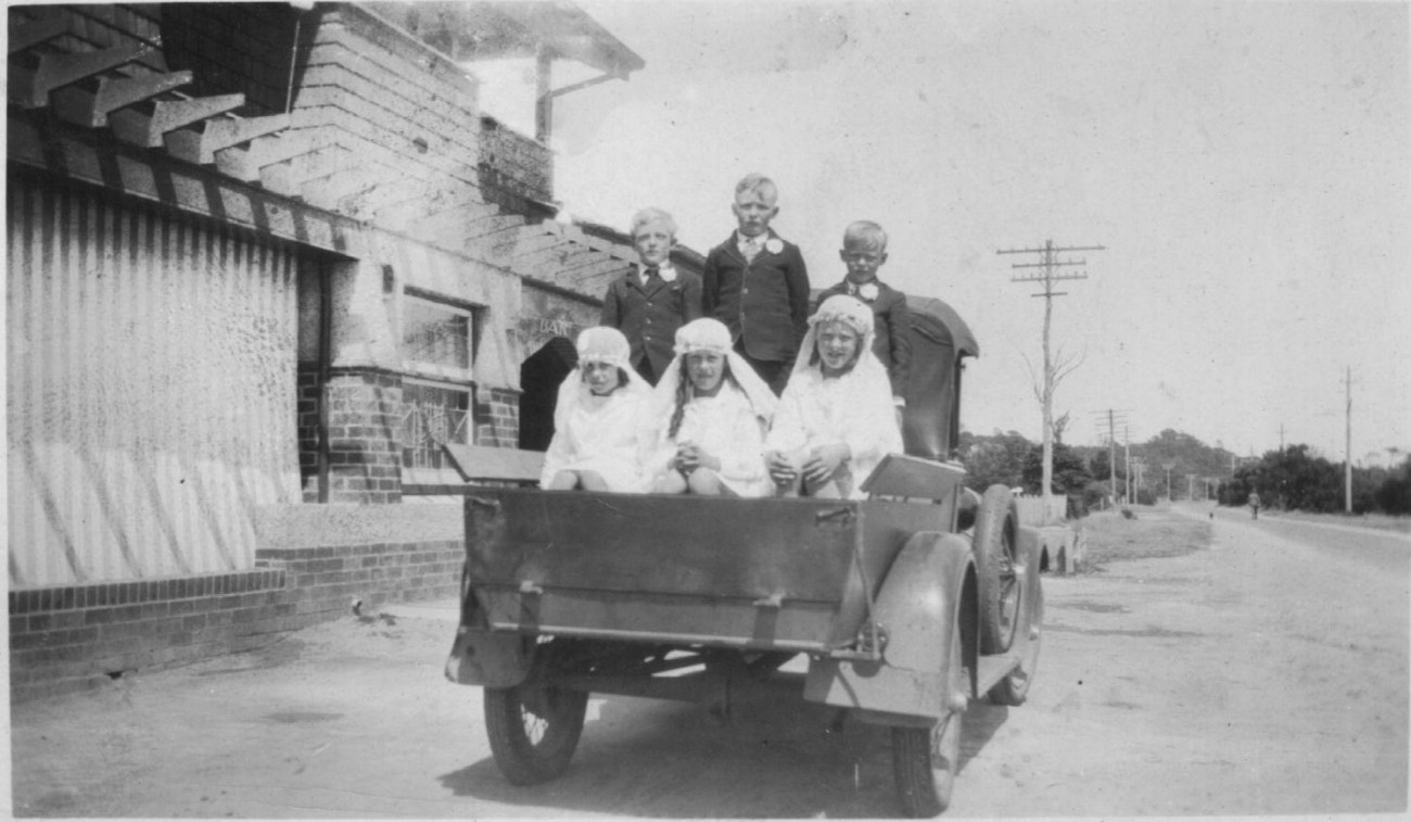 DESCRIPTIONGroup of Children outside the Rye Hotel; Group of children outside Rye Hotel on truck