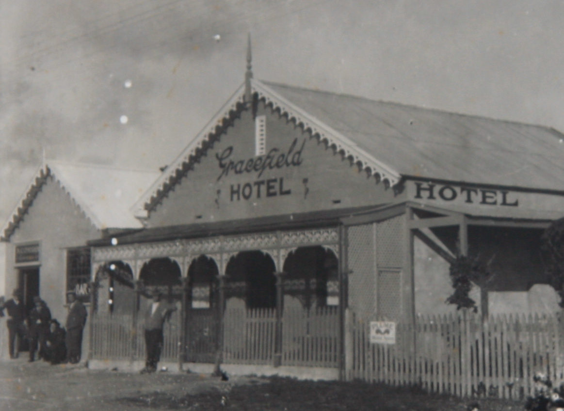 DESCRIPTIONGracefield Hotel c. 1915+ from NorthEast 5 men outside - picket fence - Plume sign