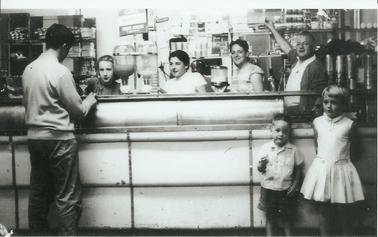 DESCRIPTIONCora Lyn Cafe. From left: photographer, Shirley Howard, Helen H, Flo & Ted H, in front Kenny & Lois Hoveler.