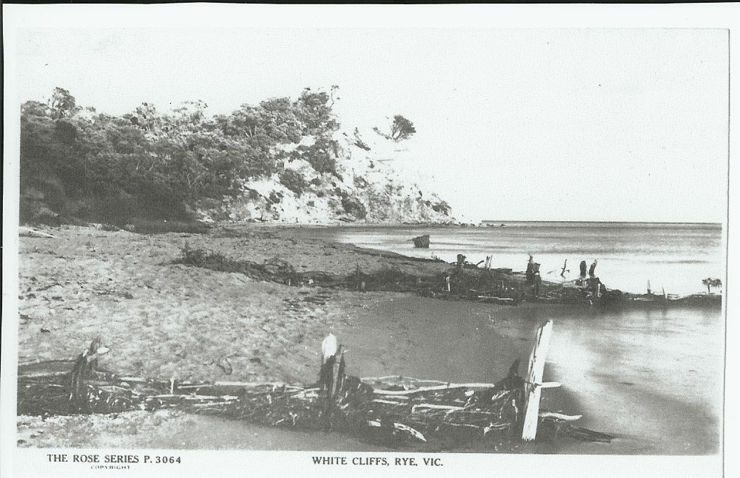 DESCRIPTIONWhite cliffs from beach with wooden groynes in foreground.