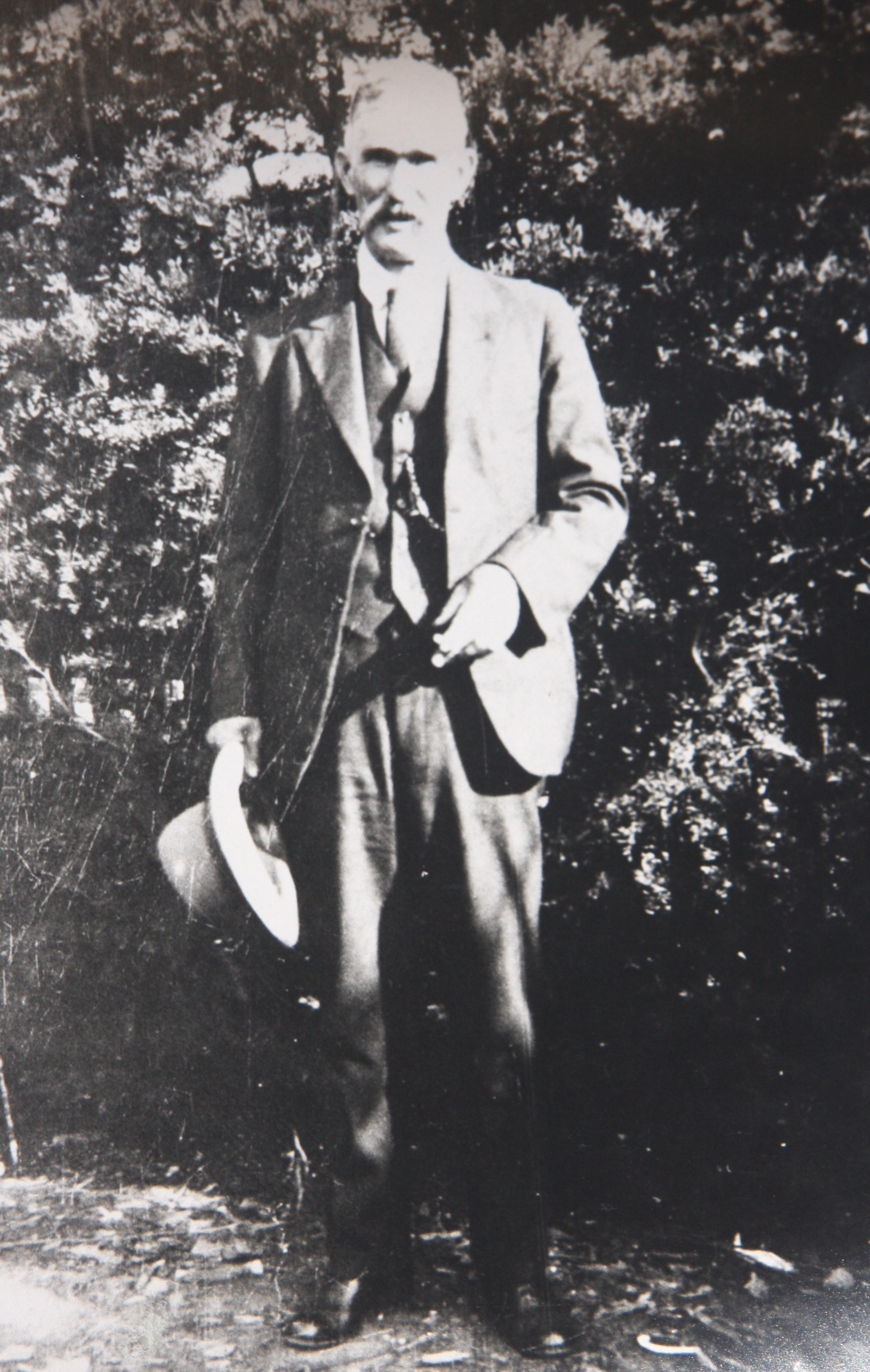 DESCRIPTIONJames Rowley in 3-piece suit, holding a hat.
