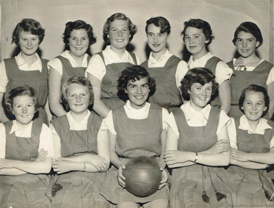 DESCRIPTIONPhoto of 11 girls girls taken inside hall. Back row standing behind seated front row. Girl centre front holding basketball. Back row L-R : Isabel Newman, Bev Jenkin,