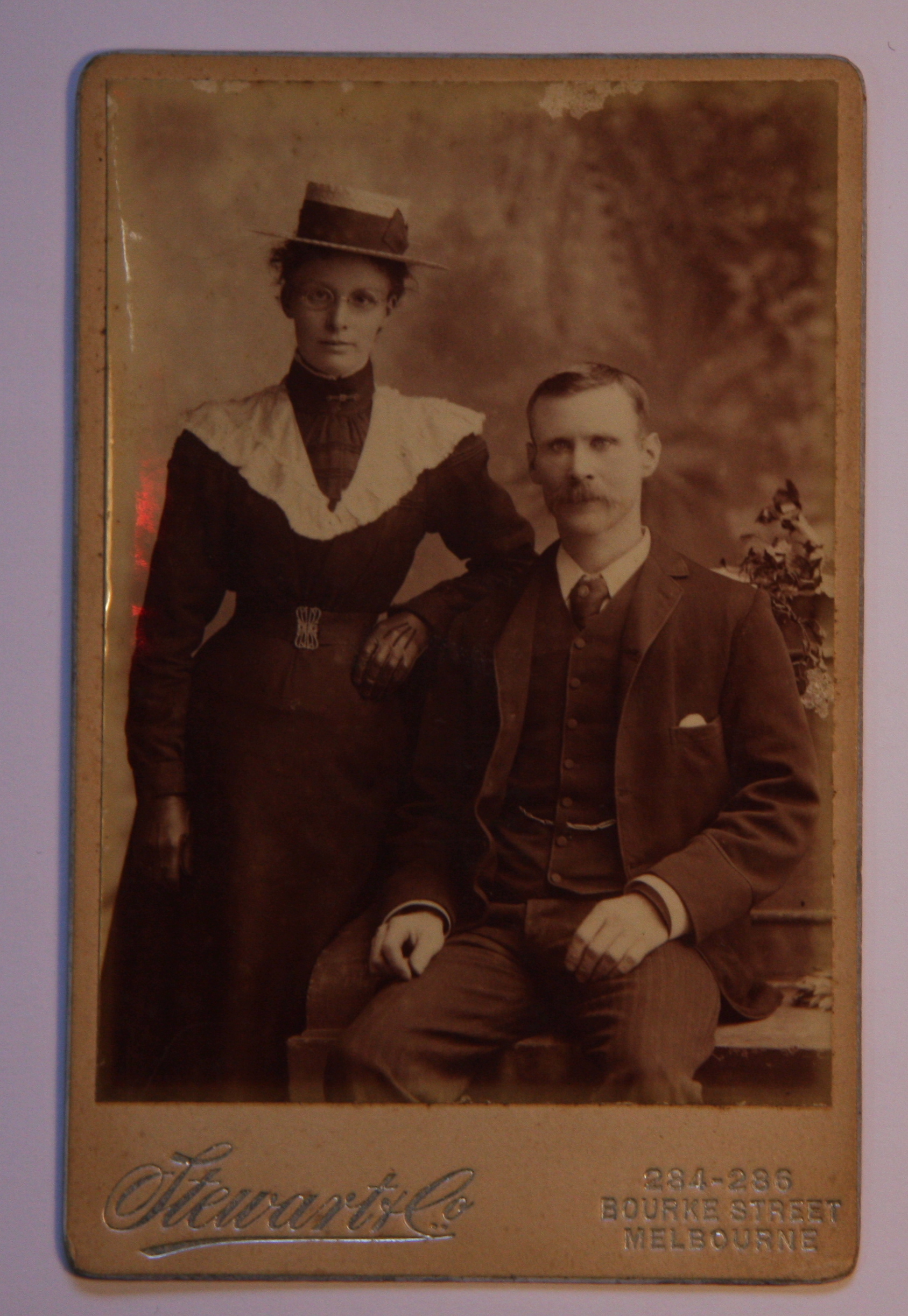 HISTORYThis image shows Nellie & James Sullivan in a photographer’s studio in Melbourne. Taken in 1900.