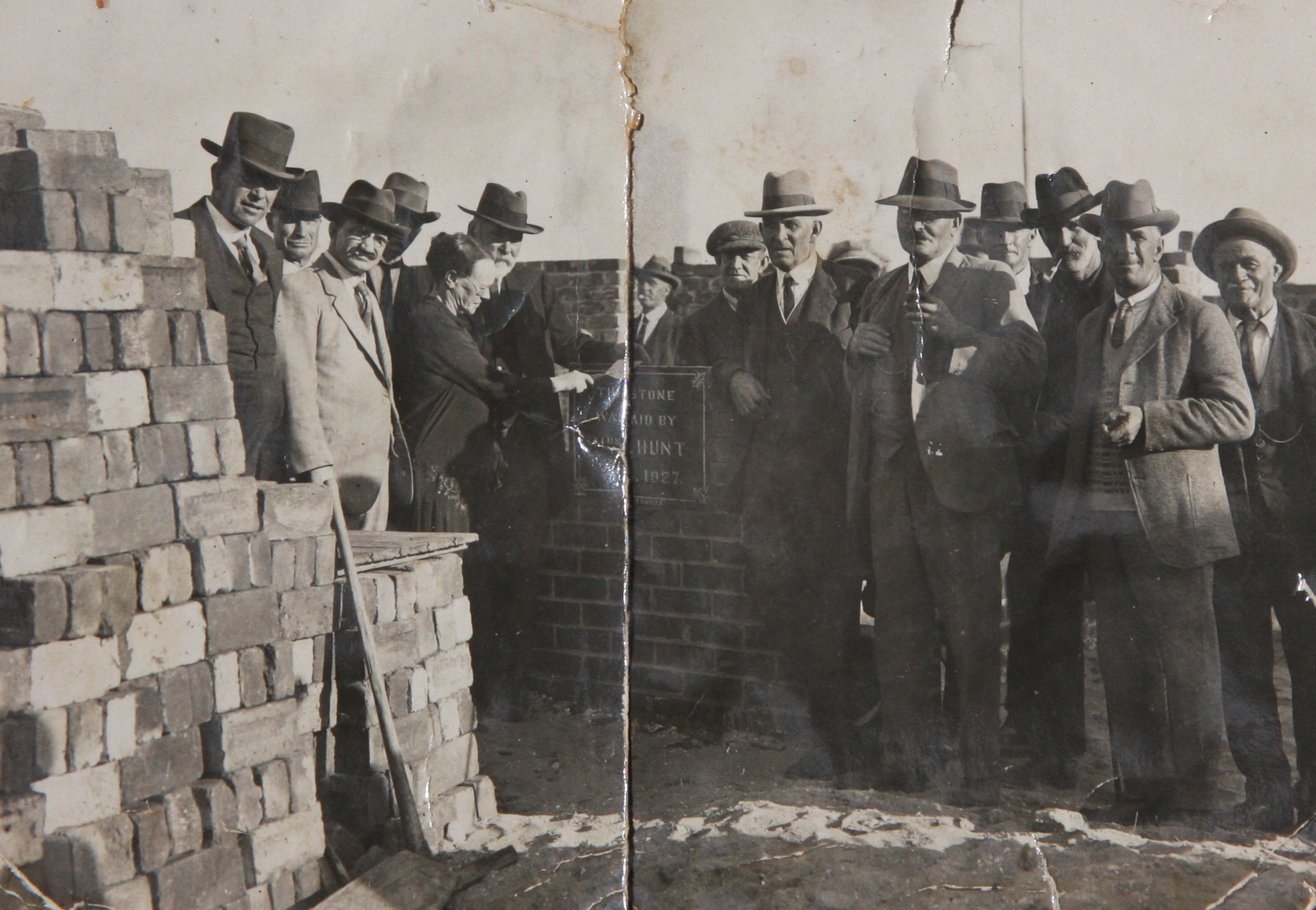 DESCRIPTIONMrs A Hunt (Proprietor of Rye Hotel) laying the foundation stone in 1927, surrounded by many (unknown) male citizens.