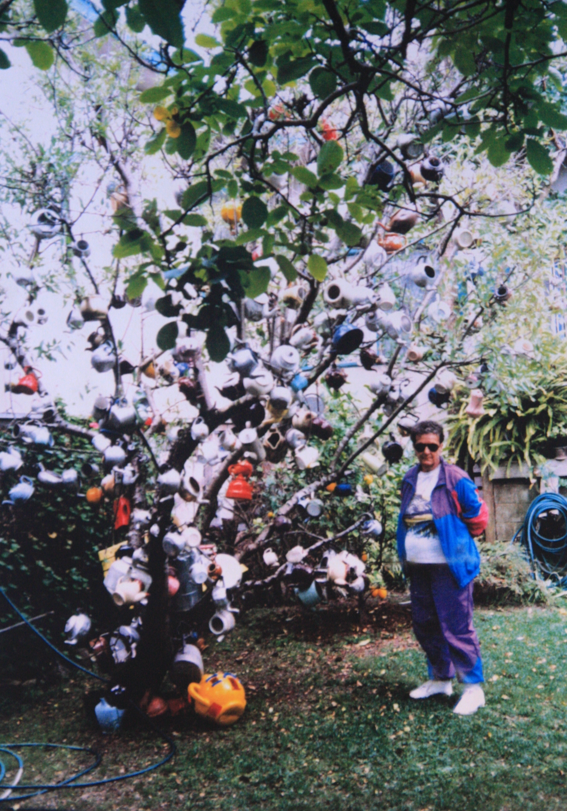 DESCRIPTIONA4 copy of photo tree with numerous tea-pots of varying kinds. Edie Cameron by side of tree.