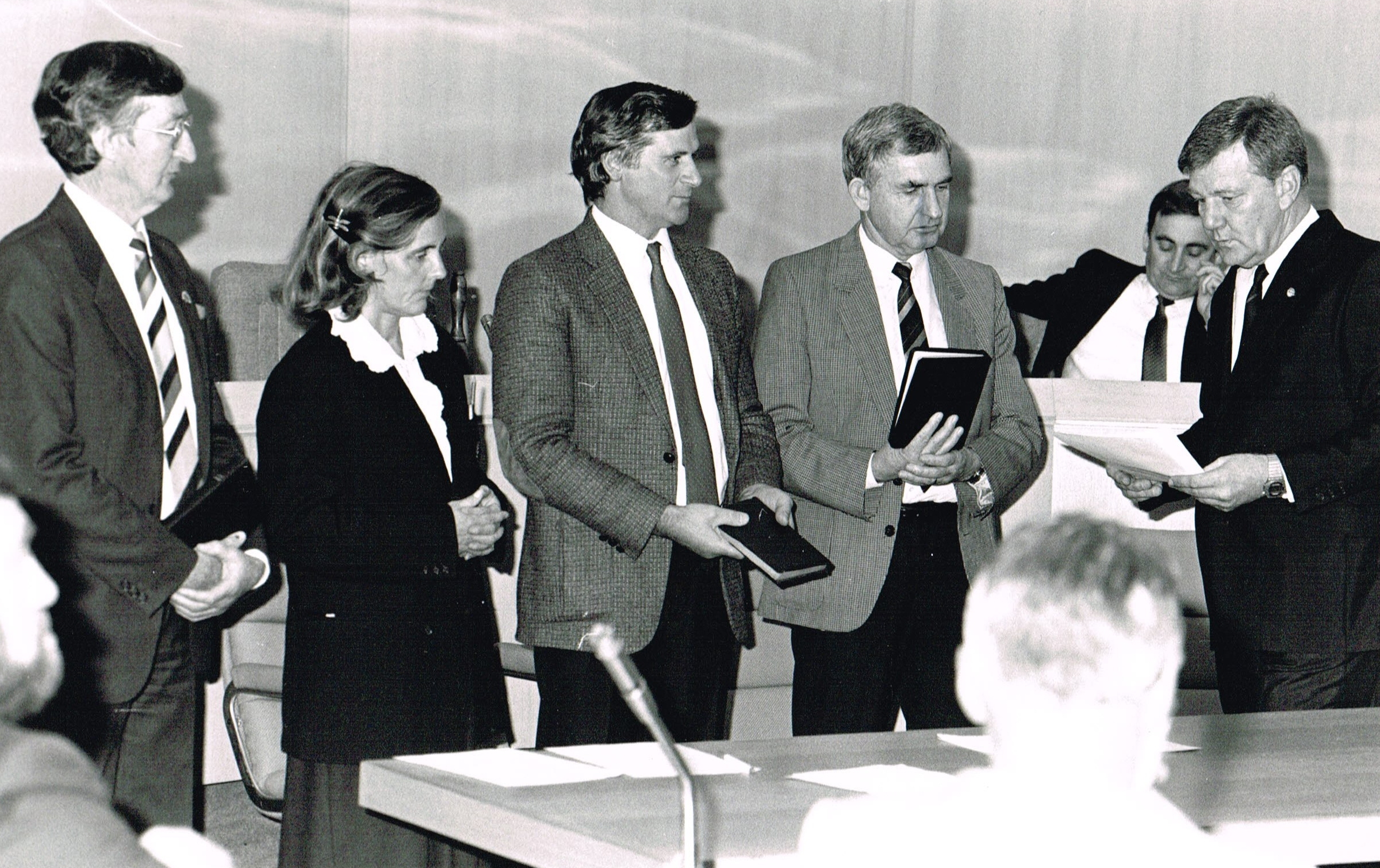 Swearing-in of a new councillors of Flinders Shire 1987. Men in jacket and tie, lady in skirt with white blouse and dark jacket