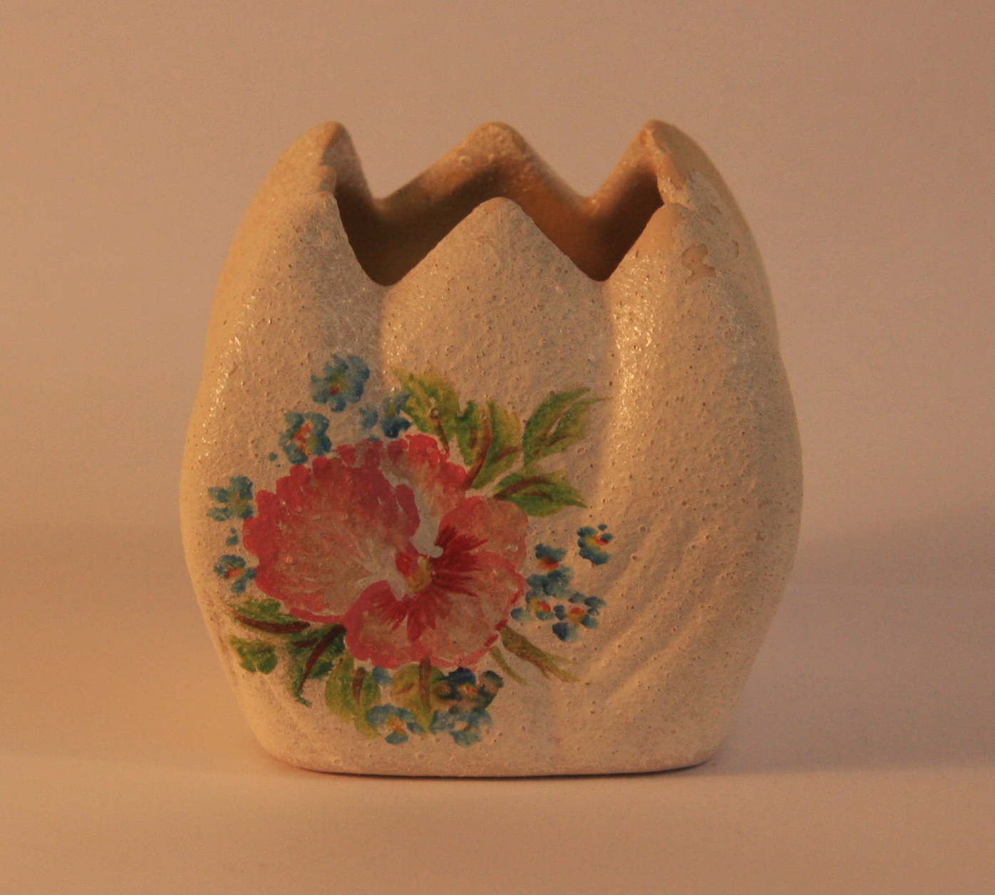 DESCRIPTIONSmall pottery vase - square “bud” shaped. Rough cream outside, yellow inside. Hand painted floral pattern on 2 sides.
