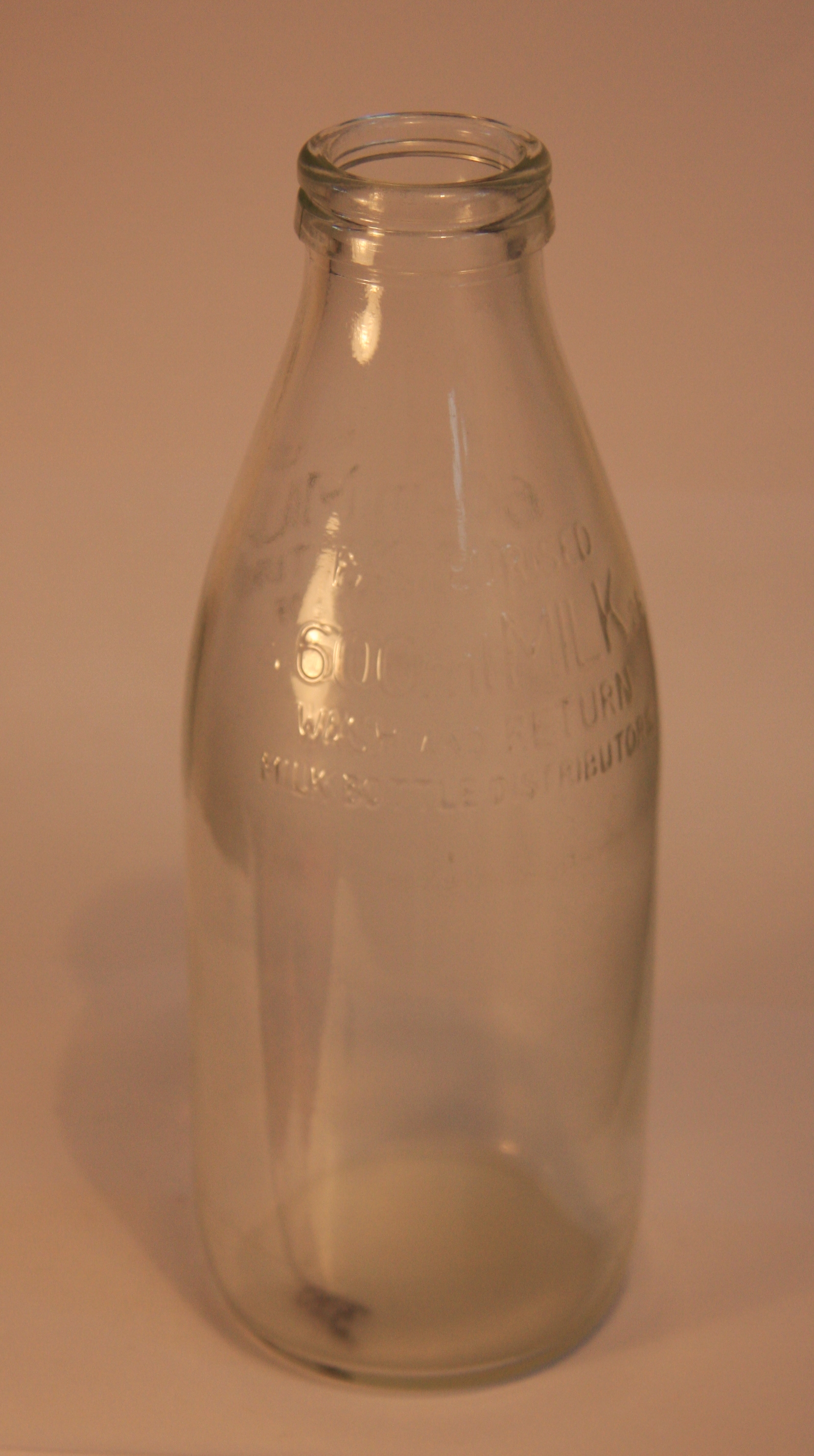 DESCRIPTION600ml milk bottle. Inscription reads: “600ml milk 26. Wash and return.”