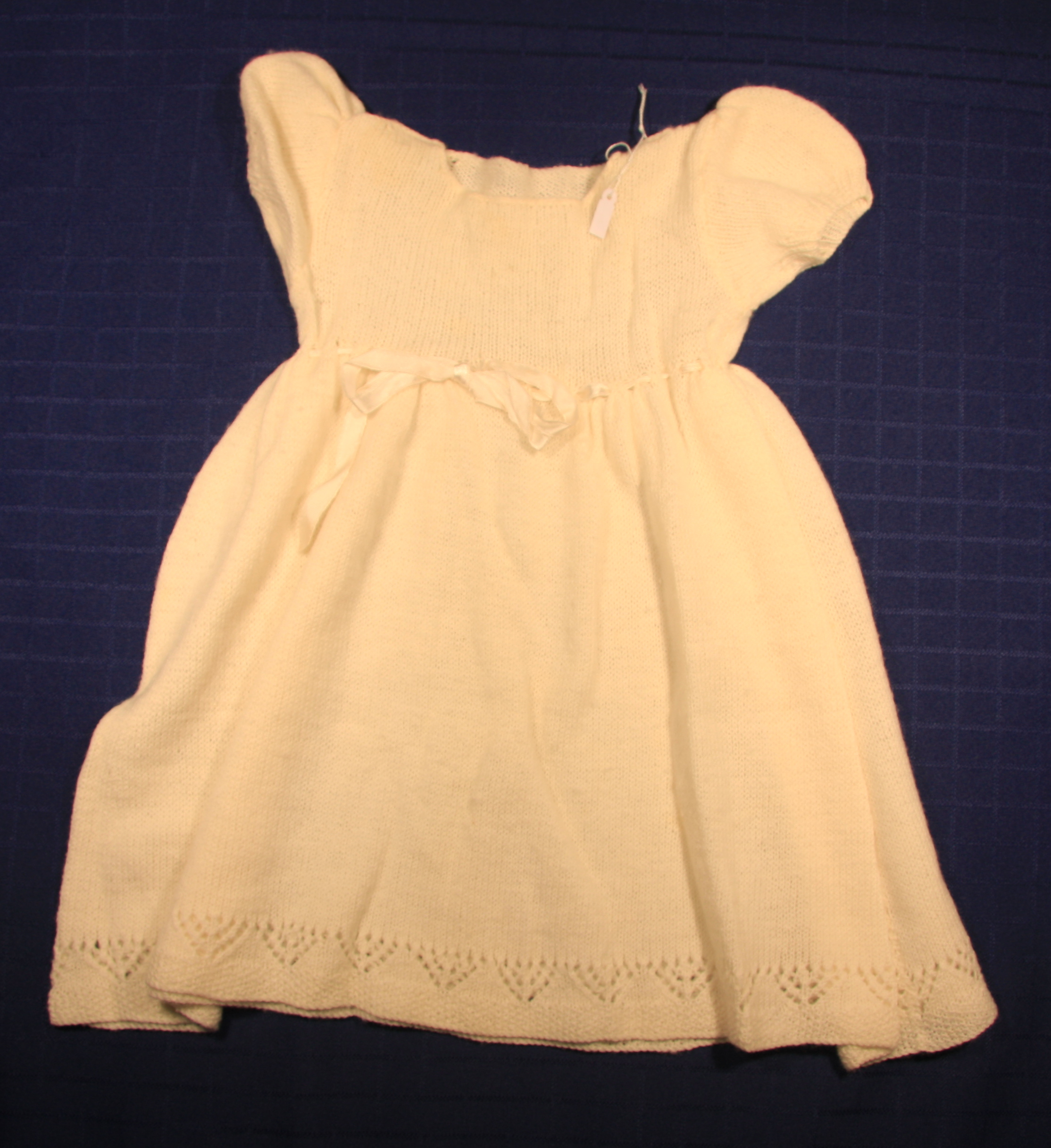 DESCRIPTIONPlain knitted white woollen dress with ribbon tie under arms.