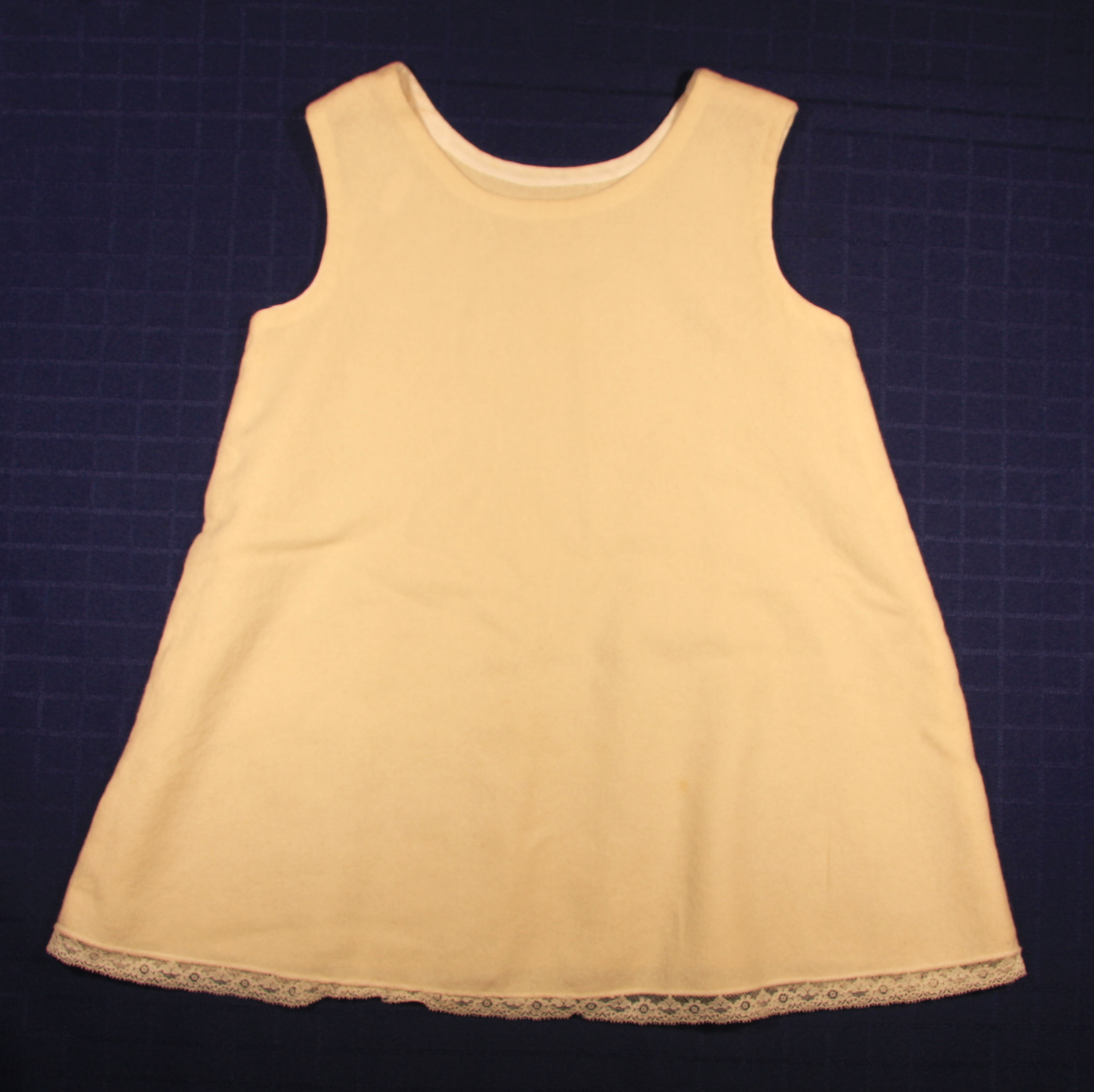 DESCRIPTIONWhite baby handmade flannelette petticoat. Bias binding at armholes. Lace trim at bottom,