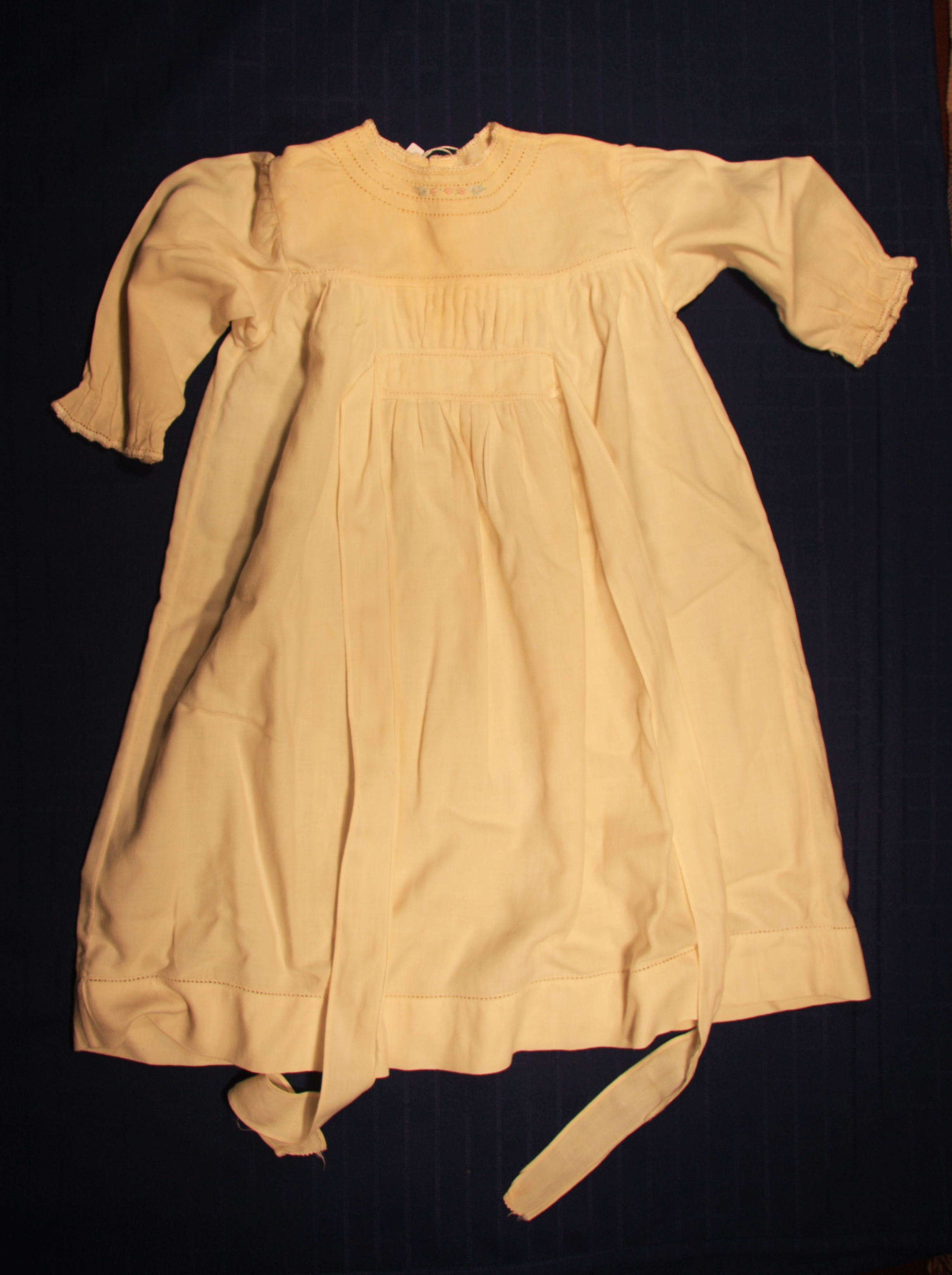 DESCRIPTIONCream baby nightdress. Long sleeves. Crocheted neck and wrist. Fancy work. Roses at neck.