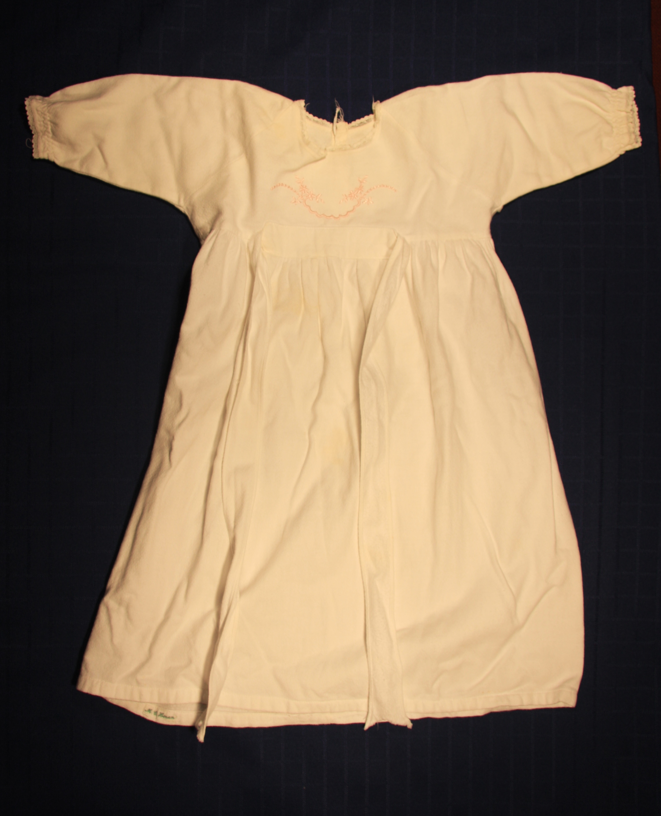 DESCRIPTIONWhite baby nightdress - long sleeves. Fine fleecy lined cotton. Pink handwork on bodice. Lace around neck and wrists.