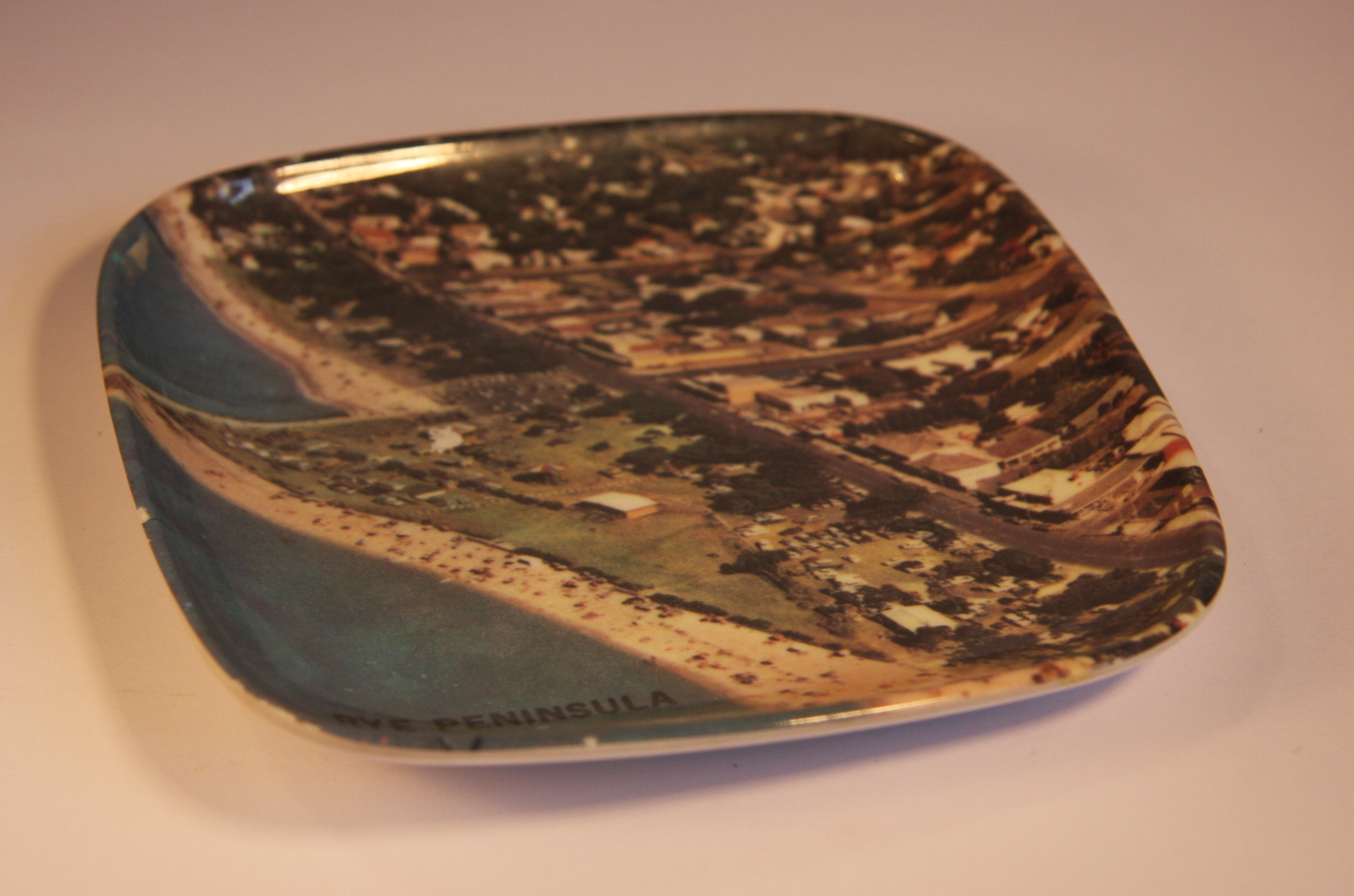 DESCRIPTIONSouvenir dish with photo of Rye ic. 1950’s. before boat ramp.