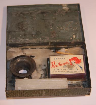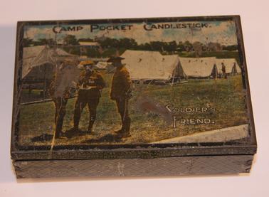 DESCRIPTIONHinged lid tin. Photo on front depicting three soldiers. World War 1 Uniform - Australian tents in background with printing “camp pocket candlestick - soldier’s friend”.