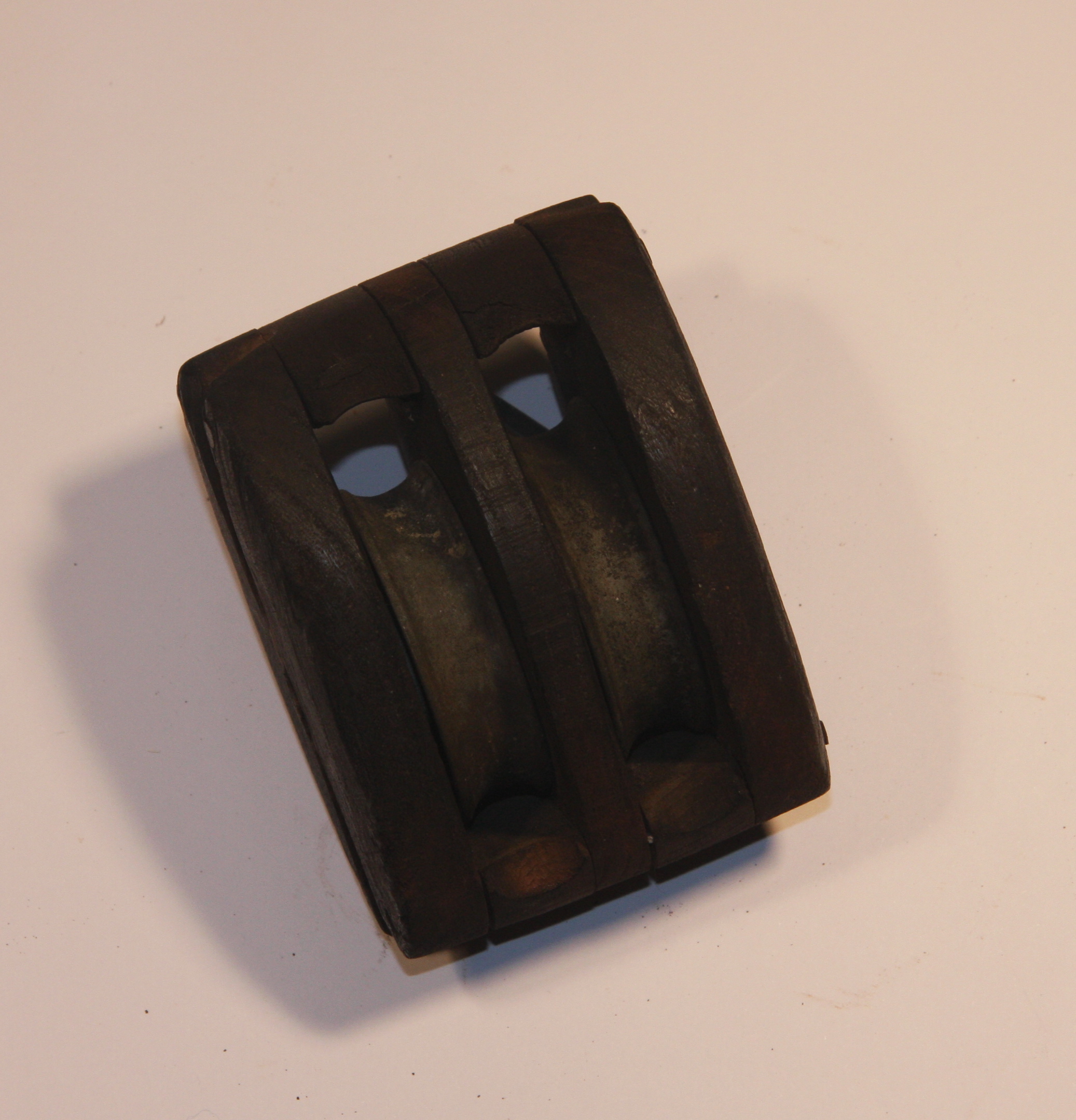 DESCRIPTIONWooden oval block to enable ropes to be pulled through for rigging. Three sections with four spacing blocks, two brass concave wheels (50 mm dia.) Held together with 5 brass rods.