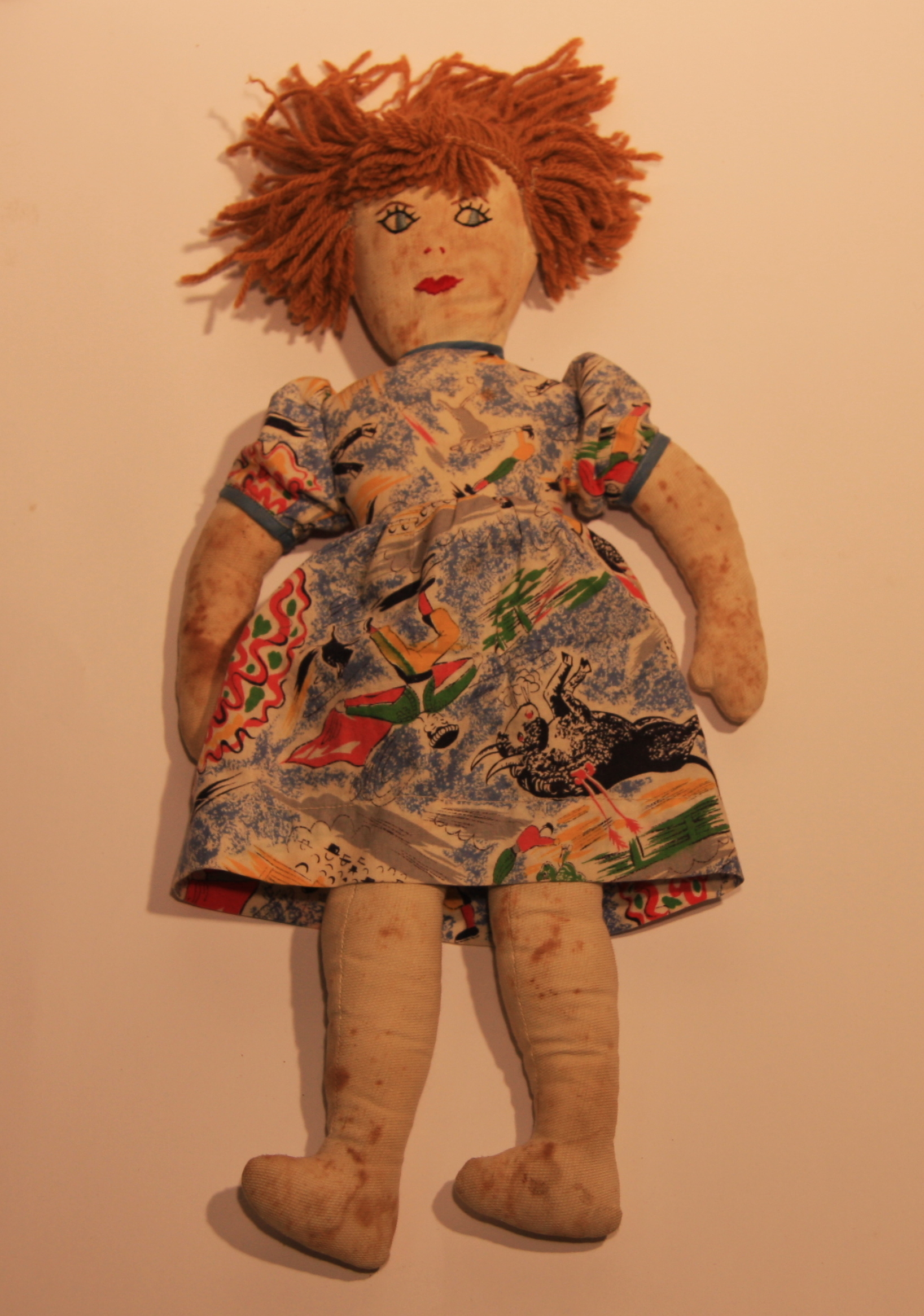 DESCRIPTIONChild’s doll - Calico body stuffed with cotton. Woollen hair, cotton dress and underwear. Embroidered facial features.