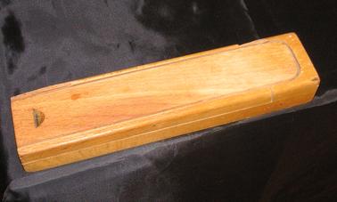Double layered pencil case with sliding lid and compartment for eraser. Writing on base in ink and pencil “Wayne” and “Herd”
