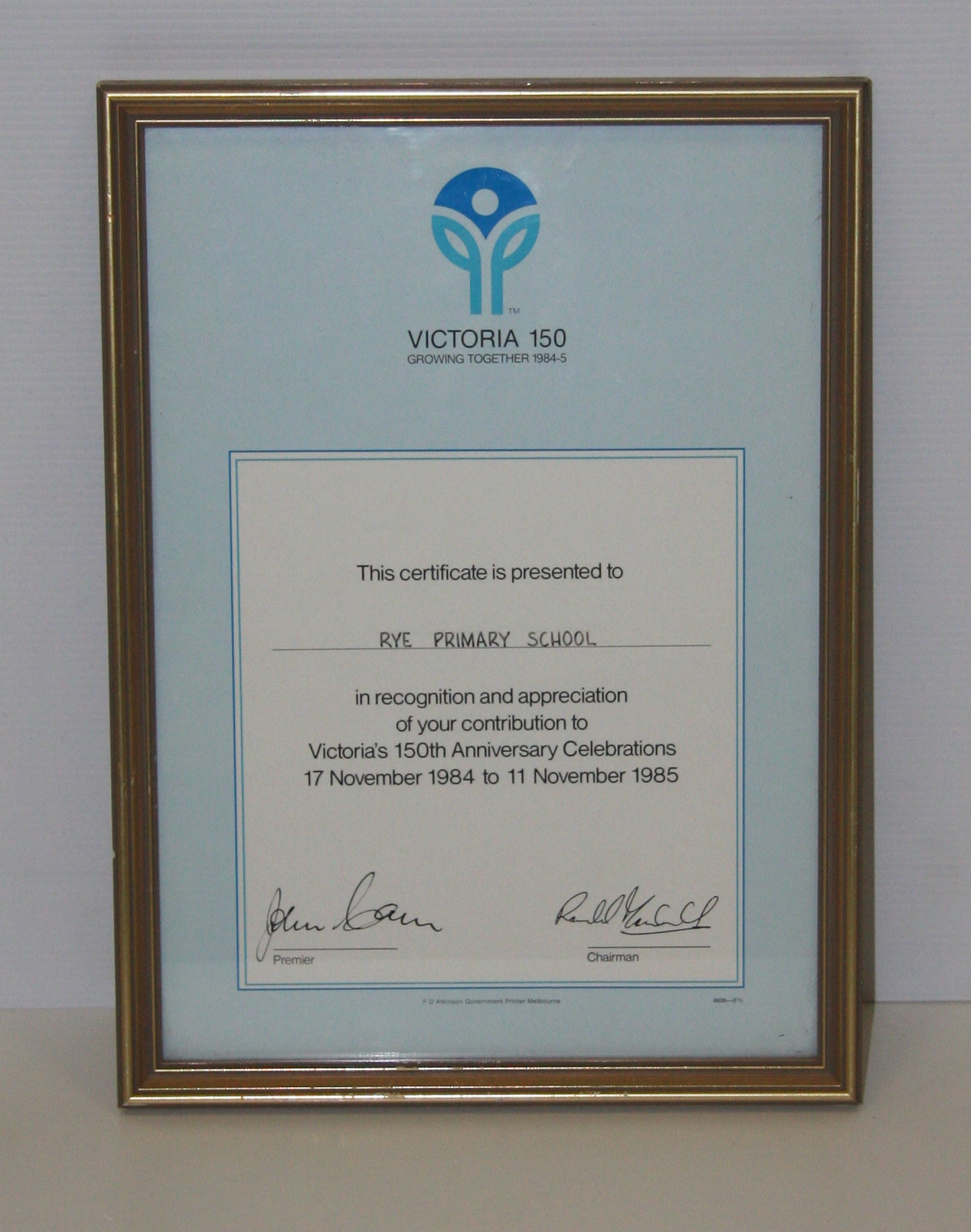 DESCRIPTIONFramed certificate “Victoria 150 Growing Together 1984-5”. Presented by Rye primary School in recognition of contribution to Victoria’s 150th anniversary celebrations 17 November 1984 to 11 November 1985