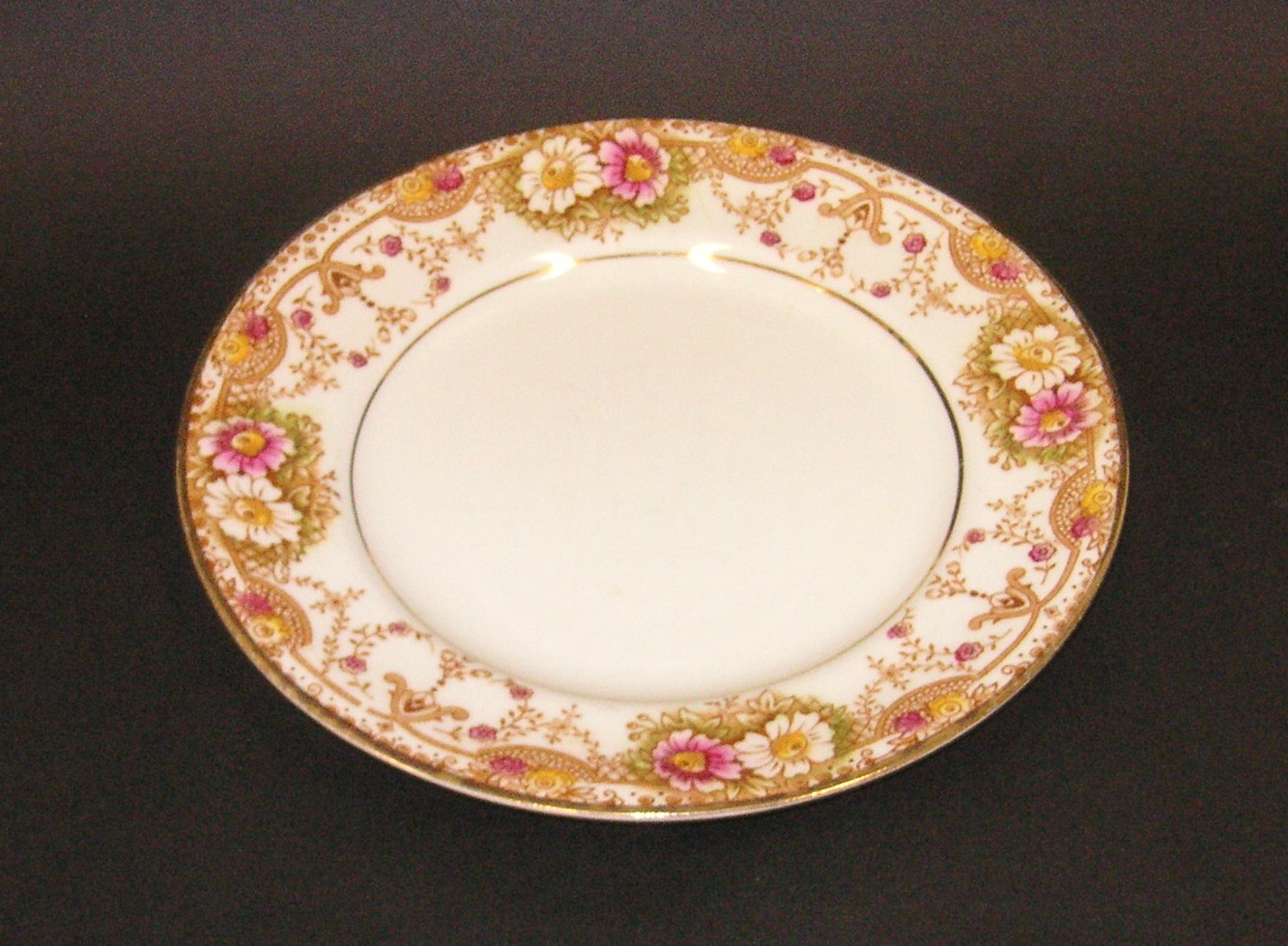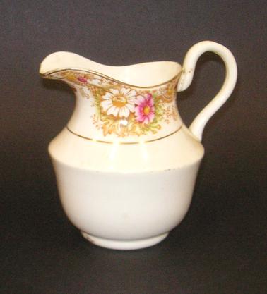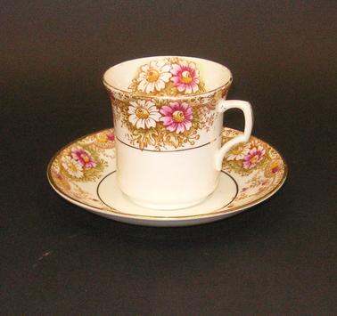 DESCRIPTIONChina tea set comprising: 5 tea cups and 6 saucers, 4 plates, jug. Decorative floral band at upper edge. Main colour: off white, with pink and gold decoration. “British Manufacture” Cups marked with number 2405.
