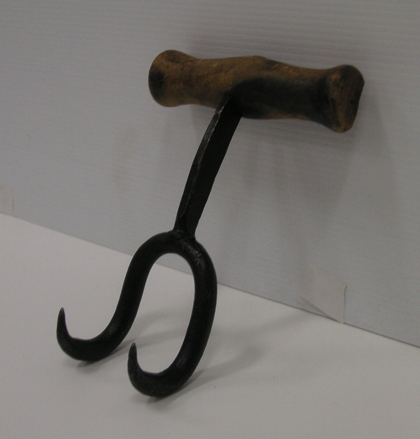 DESCRIPTIONBale hook - 2 steel hooks attached to wooden handle by one steel post.