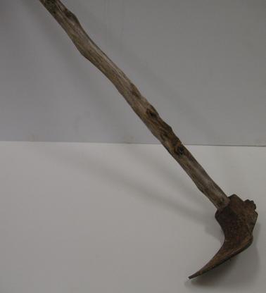 HISTORYFound in a garden in Rye. Probably had the pick head cut of and was used for hammering.