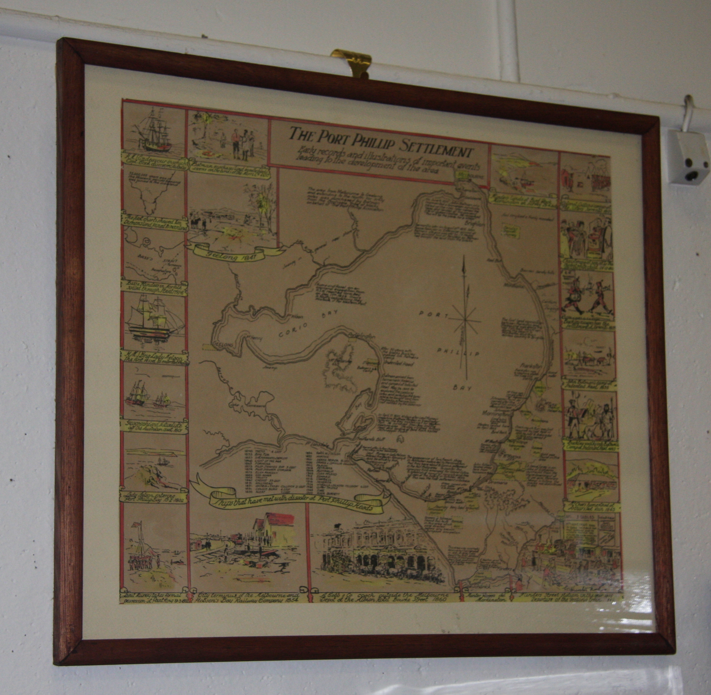 DESCRIPTIONHand drawn map and illustrations around Port Phillip Bay. History from 180., Stained wooden frame in glass cover.