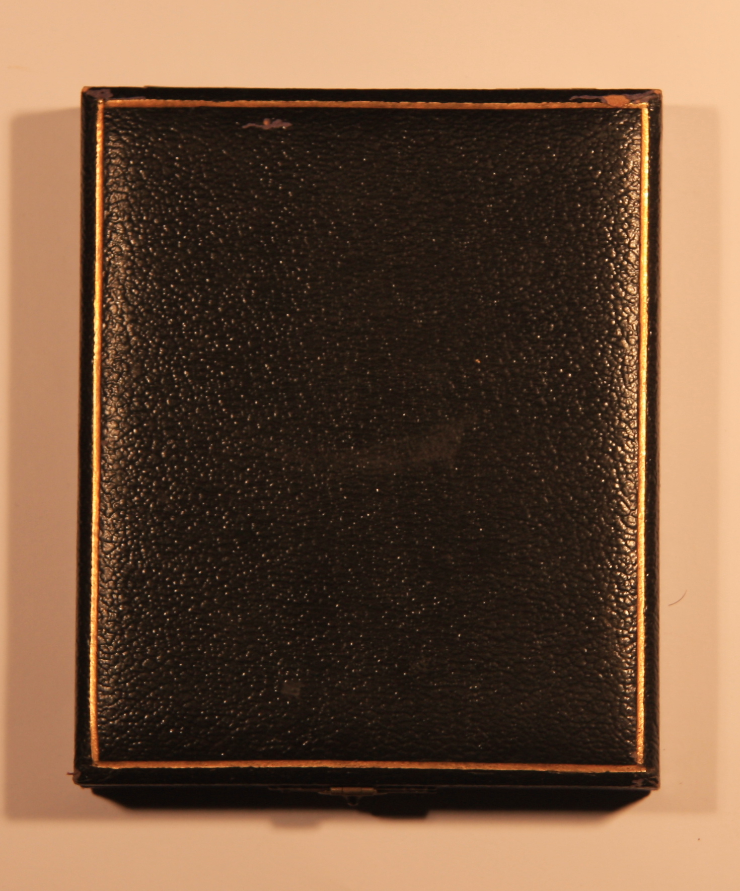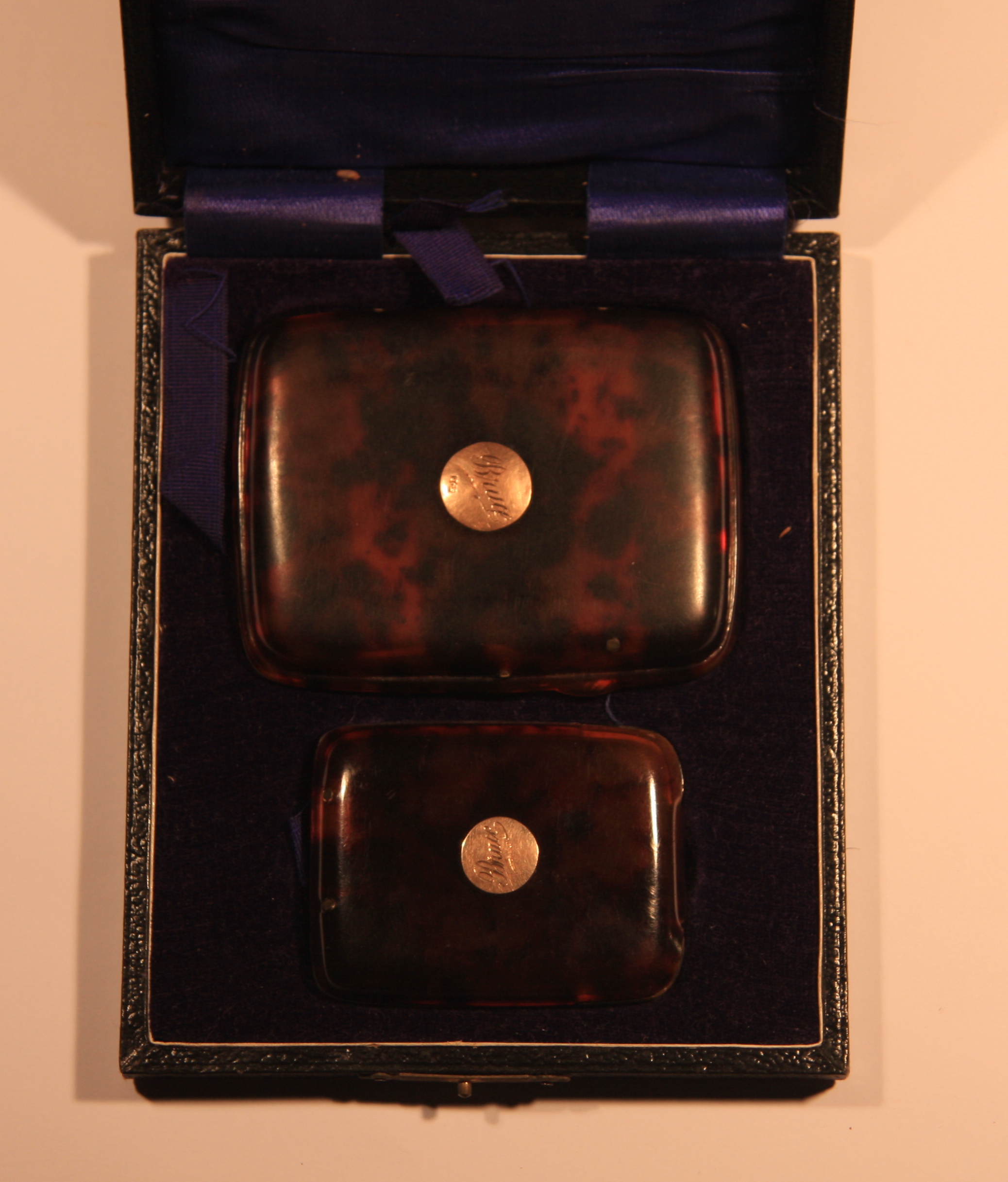 DESCRIPTIONLeather box containing 1 cigarette case and one matches case made from plastic in a tortoiseshell design. There is an inscription button in the centre of each item inscribed “Bruce”.