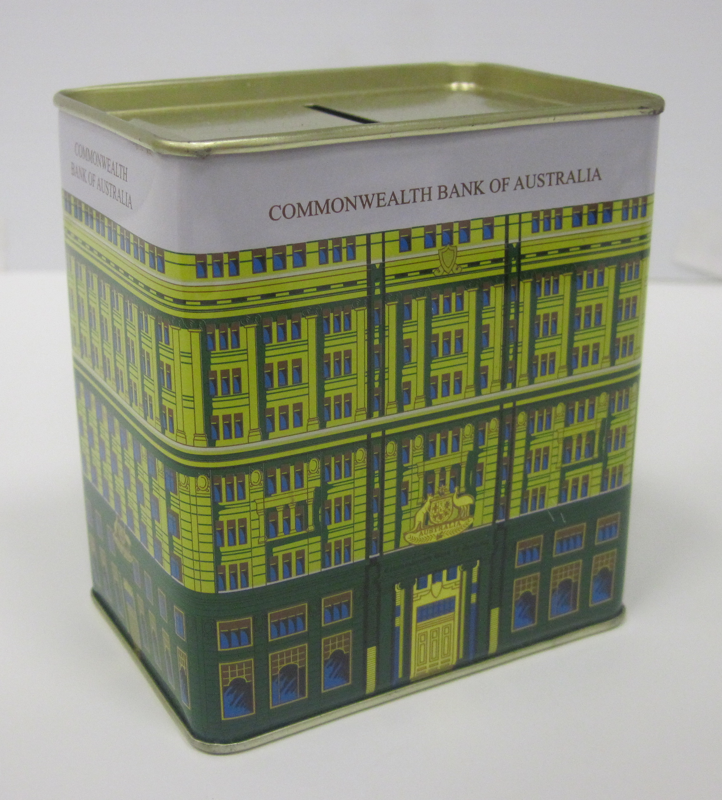 DESCRIPTIONTin money box in the shape of a building, with windows and doors denoted. Yellow and green in colour with Commonwealth Bank of Australia in gold lettering on white background at top of box.