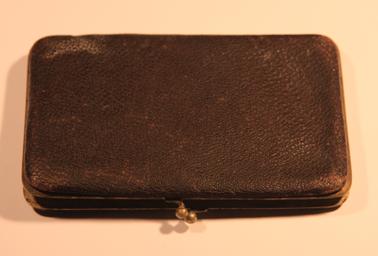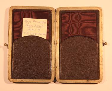 DESCRIPTIONCigar pouch - leather with taffeta lining. Two expandable pockets inside. In two halves, joined with hinge on long side. Clip to close. Pouch on each side.