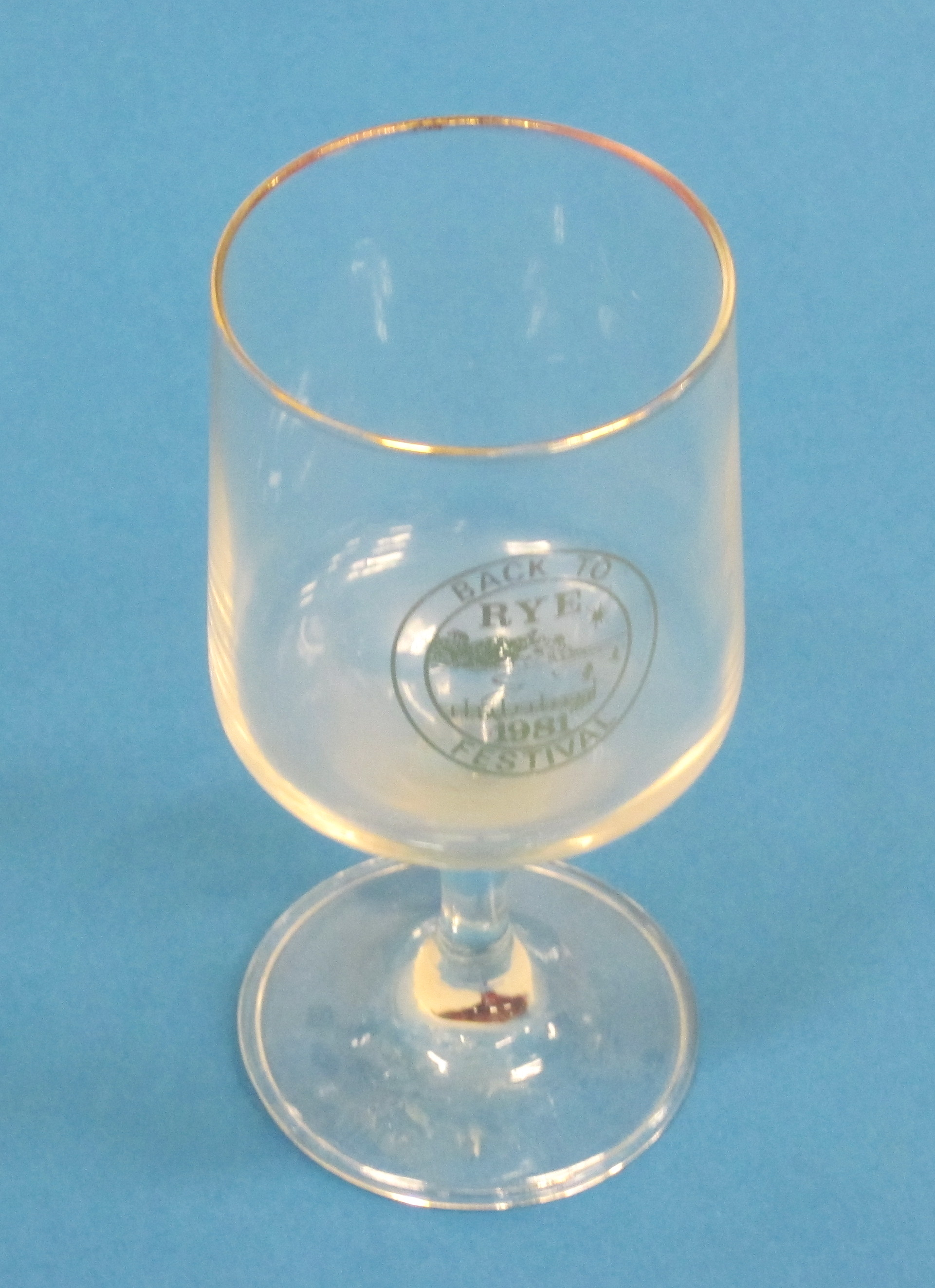 DESCRIPTIONWine glass with Rye Logo and “Back to Rye Fesitval 1981” in gold lettering
