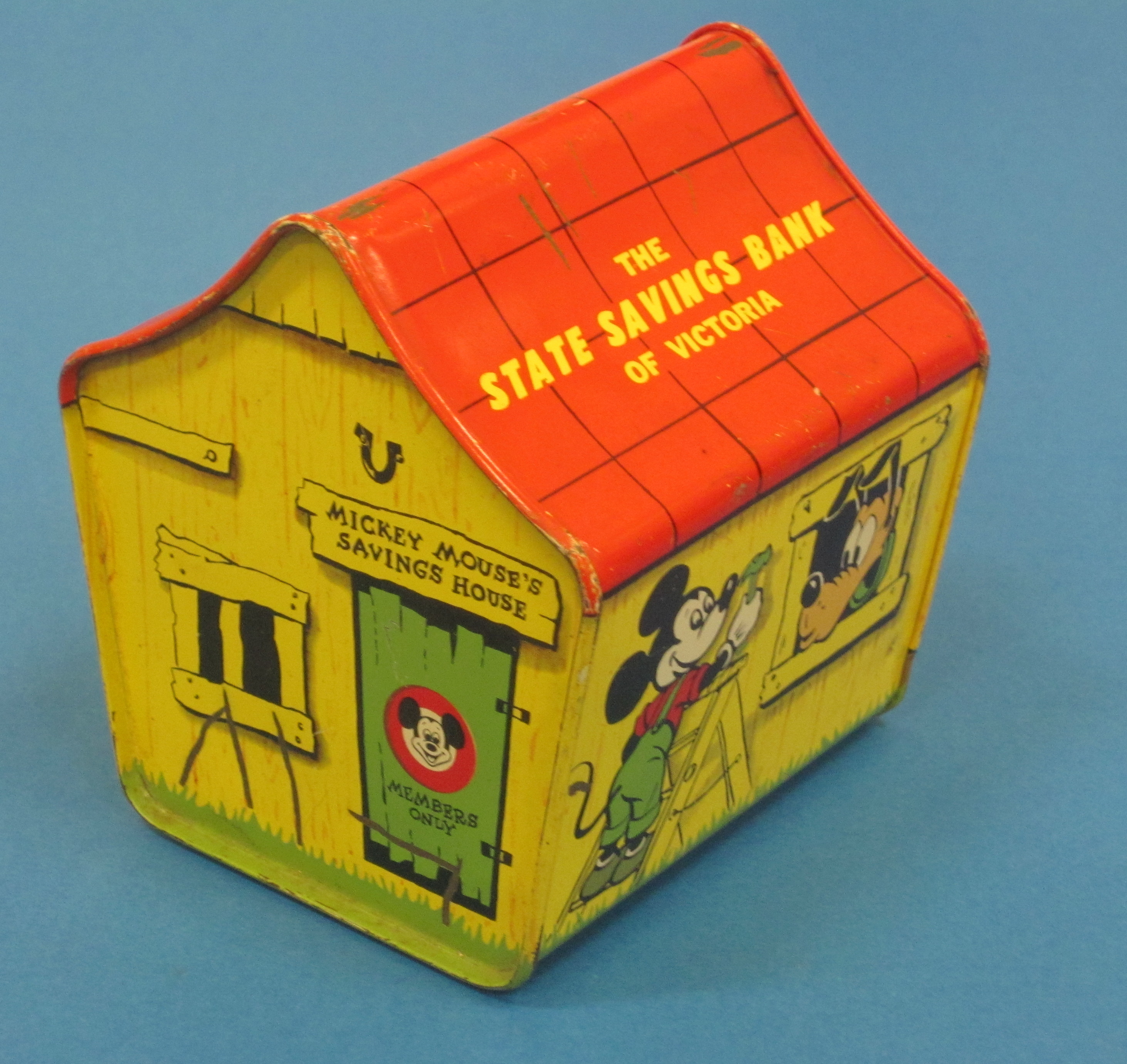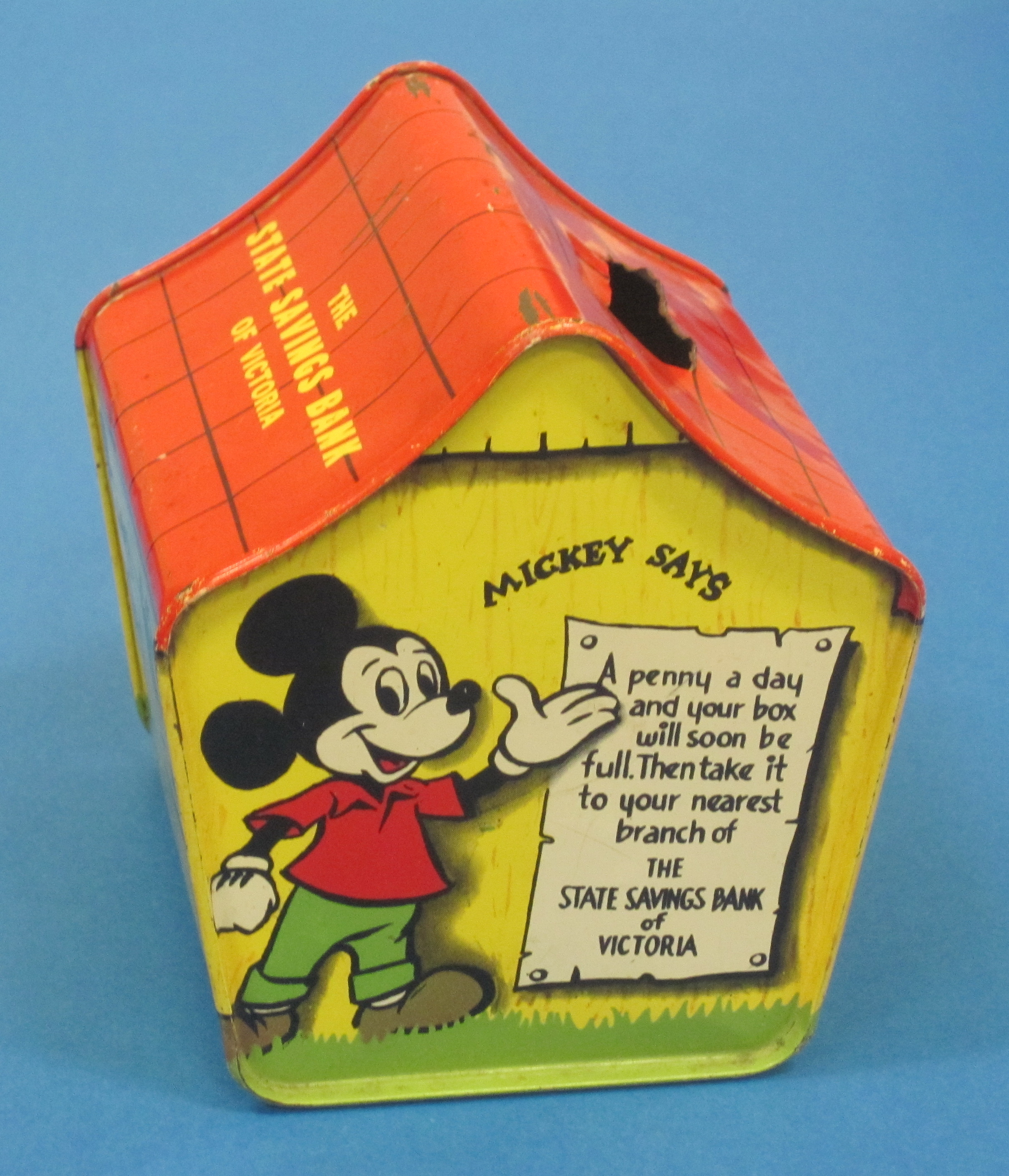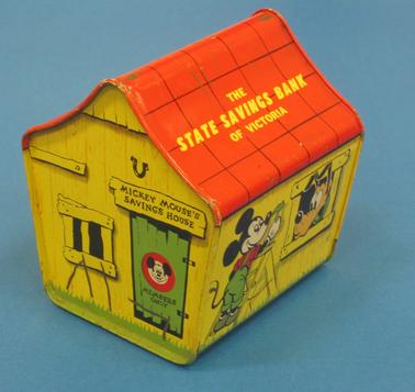 DESCRIPTIONChildren’s State Savings Bank of Victoria money box in the shape of a house with Mickey Mouse and Pluto pictures on sides.