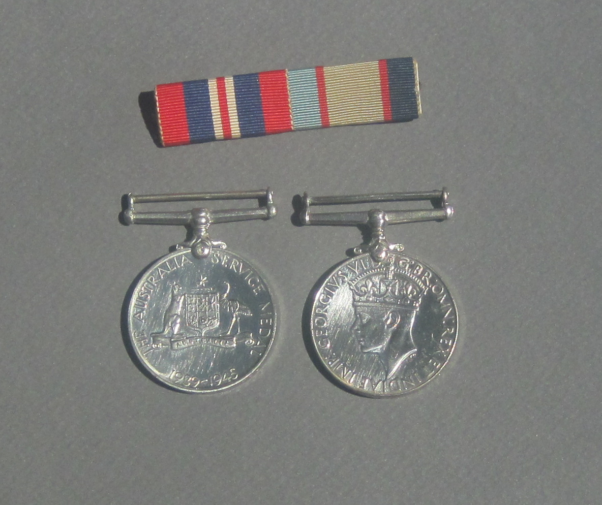 2 war service medals with holder on top attached with claw fitting to medal. Ribbon separate. War medal has George VI front and lion and eagle on reverse. Australian Service medal has George VI on front and Australian Coat of Arms on reverse. Contained in plastic box with “Siemens” logo on front