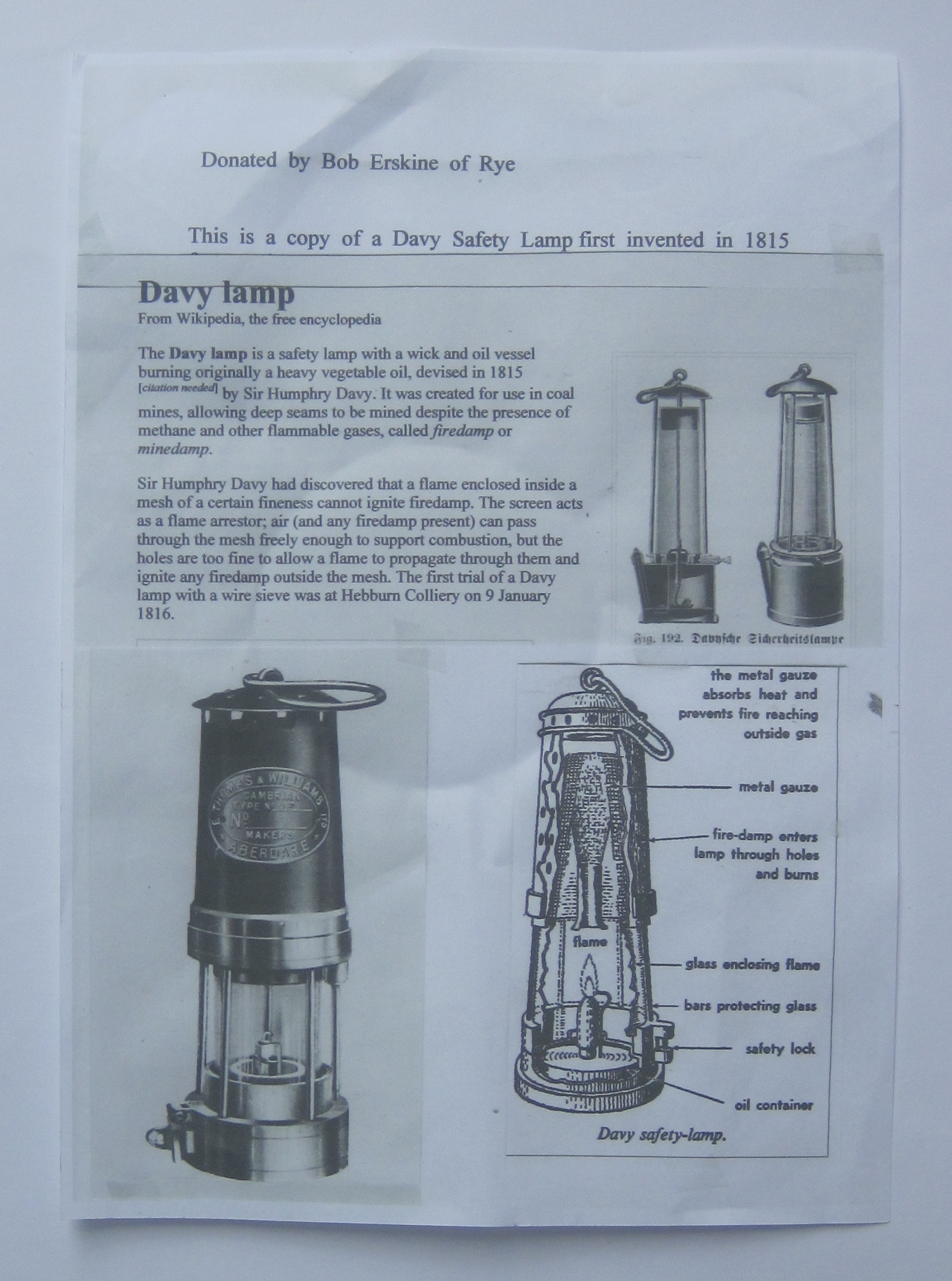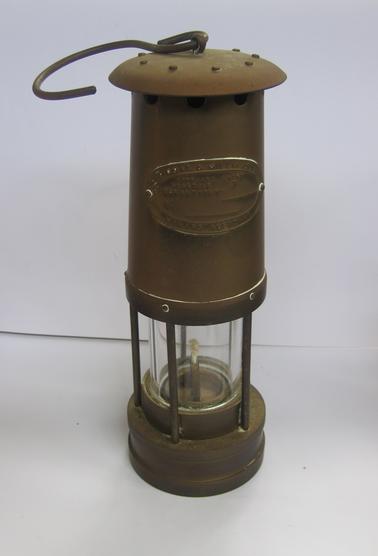 DESCRIPTIONSafety lamp with wick and oil vessel - originally burning a heavy vegetable oil. Hook handle on top. Devised in 1815 by Sir Humphrey Davy. Created for use in coal mines. .