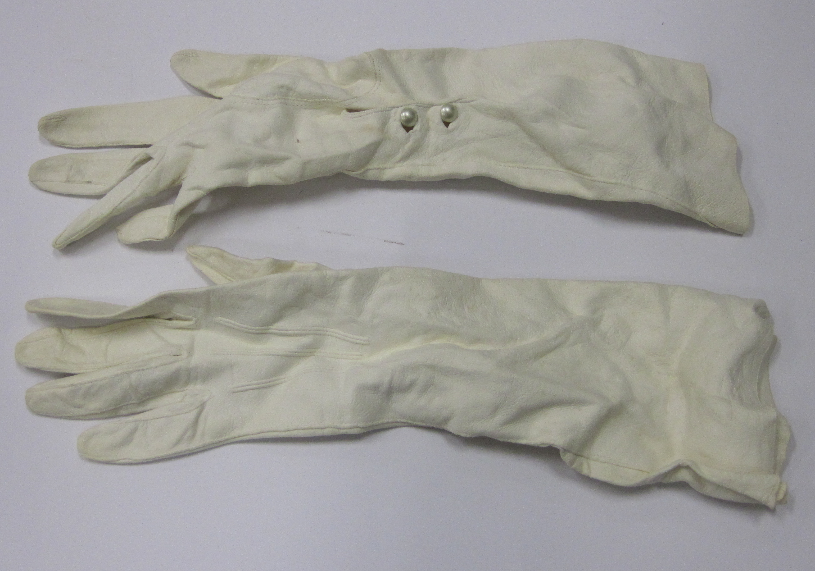 DESCRIPTIONLong white kid evening gloves with opening at wrist area, fastened by two imitation pearl buttons.