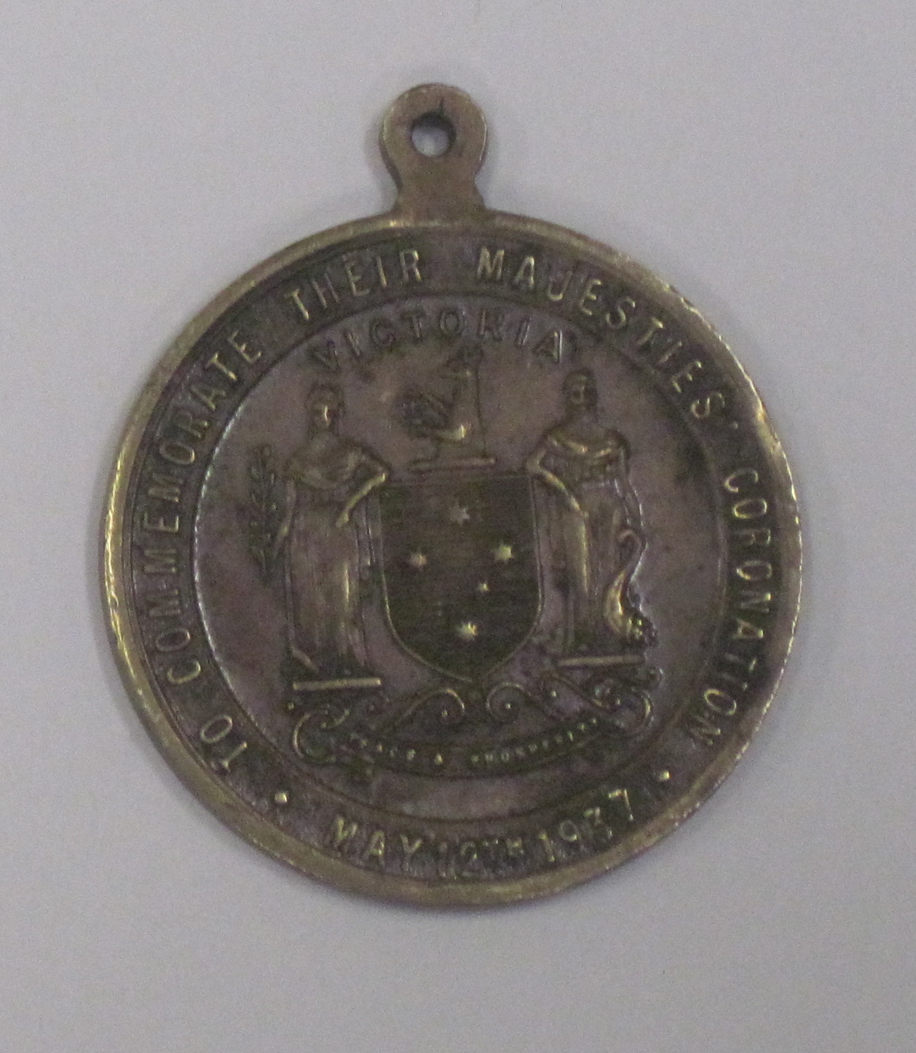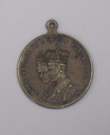 DESCRIPTIONMetal medal with eyelet for chain. Top - effigies of King George VI and Queen Elizabeth (both crowned). Bottom - Victorian Coat of Arms. Around edge the words: TO COMMEMORATE THEIR MAJESTIES’ CORONATION MAY 12TH 1937.