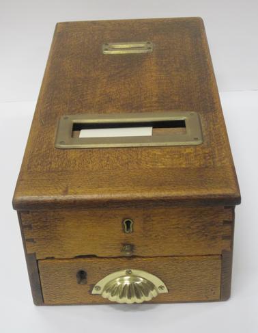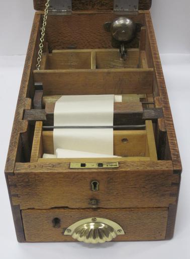 DESCRIPTIONWooden cash register with cash drawer underneath. Bell rings at the back when shutting. Roll of paper exposed on top for recording details of sales.