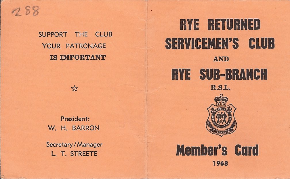 DESCRIPTIONRye RSL Membership card 1968. Lionel Martin - Life Member