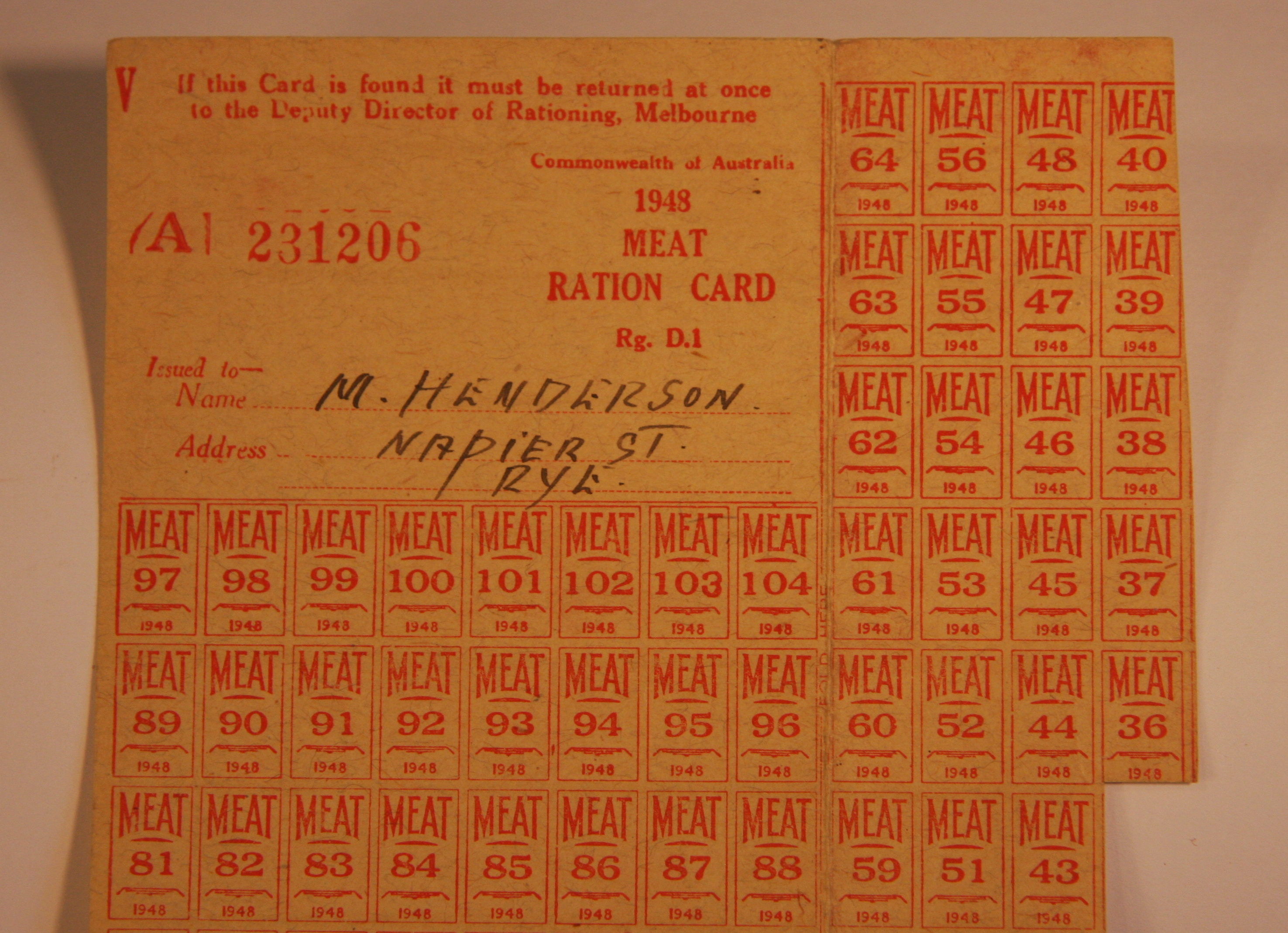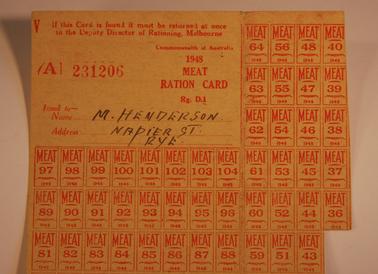 DESCRIPTIONMeat Ration Card issued to M. Henderson, Napier St, Rye 1948. Card No. (A) 231206.