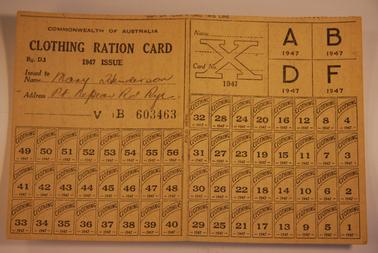 Clothing Ration Card issued to Mary Henderson, Pt. Nepean Rd, Rye 1947. Card No. B 603463